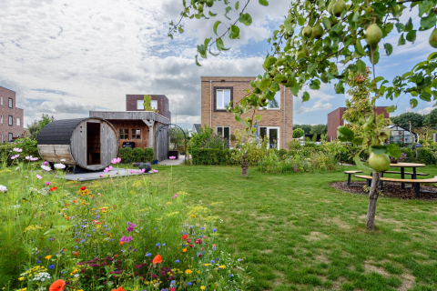 De achtertuin is grotendeels deels bestraat en voorzien van een plantenborder. Er is een watertappunt aanwezig en elektra.